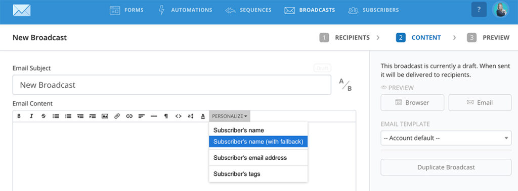 In Convertkit you simply select ‘Subscriber’s Name (with Fallback)’ from the ‘Personalize’ Menu and it gives another set of code if there is no first name on file – so instead of ‘Hello First Name Goes Here’ – it will simply say ‘Hello’. Here’s more from the Convertkit on personalizing emails.